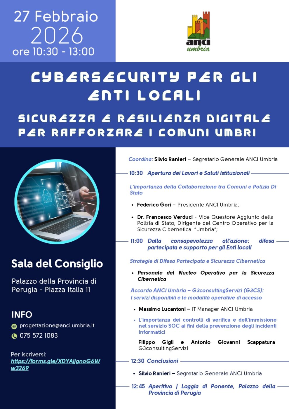 Si terrà venerdì 27 febbraio dalle ore 10:30 alle ore 13:00, presso la Sala del Consiglio del Palazzo della Provincia di Perugia, l’evento dedicato agli enti locali sul tema della sicurezza informatica